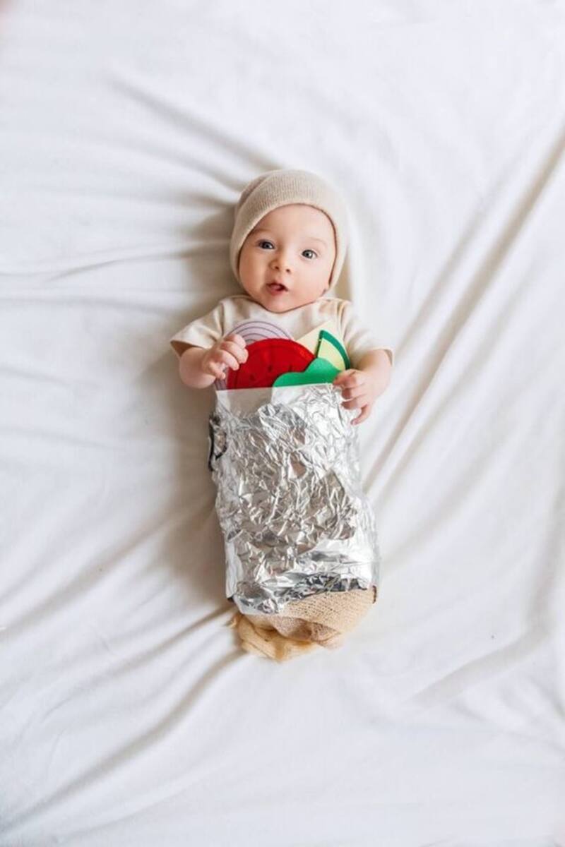 Si tienes a cargo a un pequeño para estas fiestas, puede ser la oportunidad perfecta para convertirlo en un delicioso baby-burrito. Puedes crear tomate, lechuga y pollo con pañolenci y forrar una parte —no todo, por supuesto— de un pañal con papel aluminio. ¡Darán ganas de comérselo!