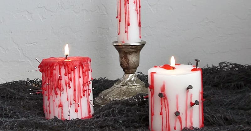 Si vas a hacer una fiesta, este detalle puede ser el centro de atención en tu mesa o arrimo de entrada. Para hacer una vela sangrienta necesitas una vela blanca y una vela roja o lápiz cera rojo. Es tan simple como encender tu vela roja —o derretir un poco del lápiz de cera o crayón— y dejar que la esperma caiga sobre la vela blanca. Cuánta sangre tengan depende de cuánta esperma caiga en las velas blancas. También puedes agregarle clavos o alfileres, para hacerlo aún más gore. El tutorial aquí.