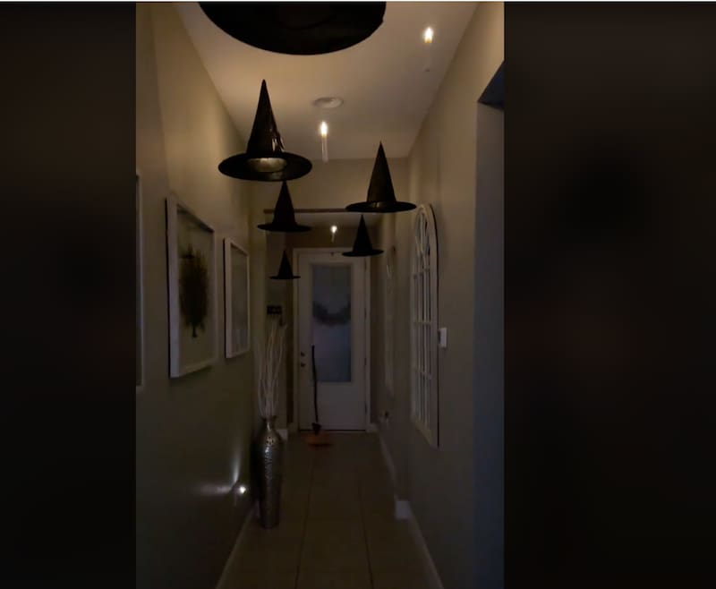 En la misma línea de velas flotantes, otra idea es colgar sombreros de bruja. Es tan simple como usar sombreros de bruja viejos —o comprarlos en alguna tienda de disfraces—, y luego colgarlos con la ayuda de hilo de pescar. Esta idea puede ser perfecta para un pasillo o entrada de casa. Puedes ver aquí cómo se hace.