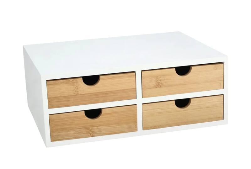 Si tienes espacio pero te faltan cajones para organizarlo, puedes sumar artículos como este, que hacen el trabajo sobre una mesa, una repisa o la superficie que hayas definido para tus productos de skincare y maquillaje. En Casaideas, por ejemplo, hay dos tipos de cajoneras: blancas minimalistas de MDF —una madera prensada—, perfectas si no quieres que se vea el interior de lo que organizas.