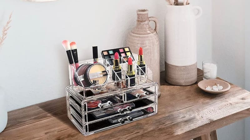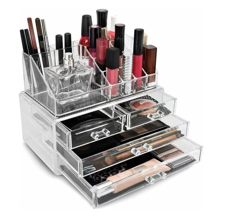 Esta es otra alternativa para organizar sobre las superficies. Pero a diferencia de las cajoneras, todo queda a la vista y además tienen muchos compartimientos especiales y específicos. El siguiente modelo combina cajones con otros pequeños receptáculos, ideales para organizar maquillaje, skincare o incluso joyas. Al ser de acrílico, es fácil de limpiar. Eso sí, no es recomendable para el baño.