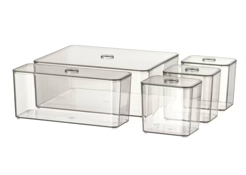 Los contenedores transparentes pueden ser de gran ayuda para usarlos en cajones o repisas, ya que son fáciles de visualizar y limpiar. Lo importante siempre es medir antes, para entender cuántos y de qué porte los necesitas. Las cajas Godmorgon, de Ikea, son una excelente opción para el baño, ya que cuentan con tapa. Contando con esta protección, evitas que los productos se humedezcan con el vapor del agua.