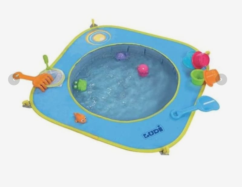 Esta puede ser un buen accesorio para guaguas. Se trata de una mini piscina que se despliega en un abrir y cerrar de ojos. Solo basta con hacer un agujero en la arena para instalarla y un poco de agua del mar para llenarla. Al ser plegable, es de transporte cómodo. Además incluye pala, rastrillo, colador, cuatro recipientes de colores en varios tamaños y cuatro amiguitos del mar: ballena, pulpo, estrella de mar y cangrejo.