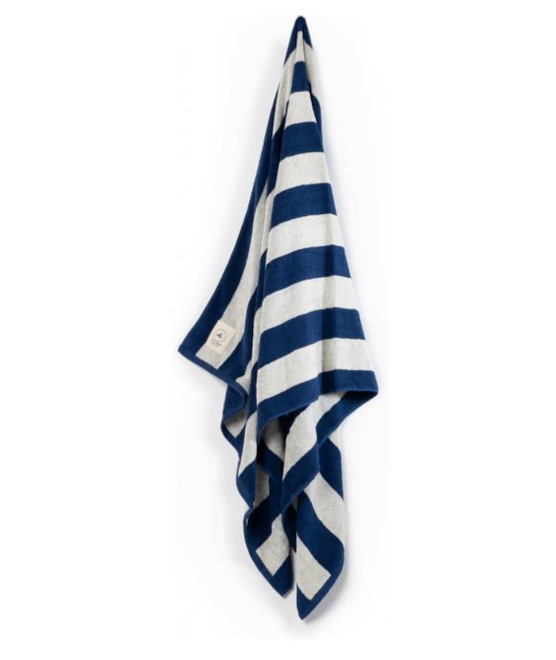 Si buscas una toalla de playa de diseño clásico, te sugerimos una blanca con líneas azules. Este modelo Dry Hood es confeccionado con 100% de algodón y tiene un gramaje de 400, por lo que además de ser suave es muy absorbente. Perfecta para echarse sobre ella después del baño de mar o piscina.