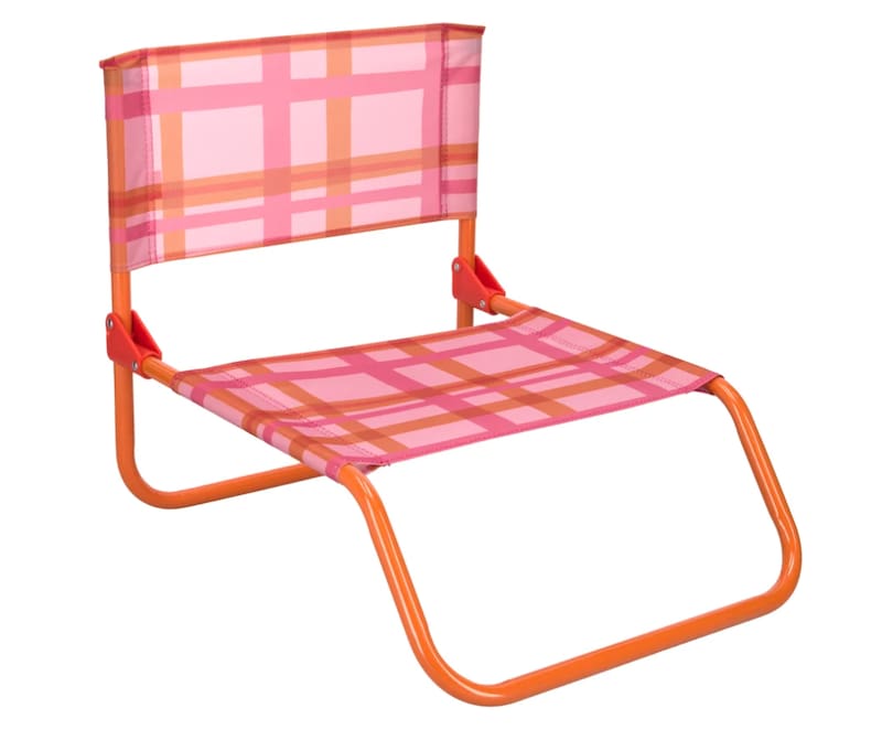 Para quienes prefieran estar más sentados que tumbados en la playa, una silla puede hacer una diferencia verdadera. Encontramos dos opciones aesthetic, pero con diferente nivel de comodidad: la primera silla es el modelo más tradicional, es decir, con un textil respirable, impermeable. Este en particular tiene un estampado naranjo con rosado.