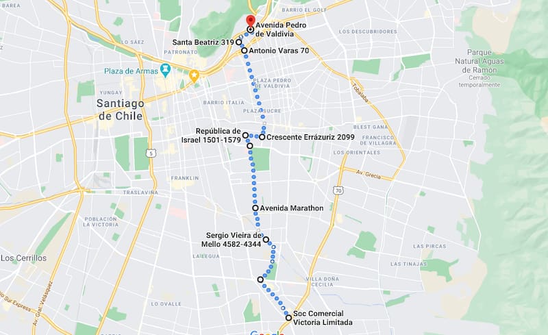 Se comienza en Santa Isabel con San Diego, en la neorromántica iglesia de Los Sacramentinos. Tomando la ciclovía hacia el poniente, que atraviesa la Norte-Sur y sigue por Gorbea hasta llegar a Exposición. Por esa calle, hacia el sur, hay otra senda que luego sigue por la Av Pedro Aguirre Cerda, la que nos deja, con algunas interferencias, directamente en el Parque Bicentenario de Cerrillos. Son 9,6 km de ida, que se recorren en unos 90 minutos aproximados.