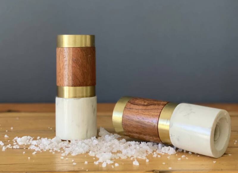 Este es otro modelo sobrio y elegante de salero y pimentero. Confeccionado con mármol y madera, estos accesorios podrían ser el complemento que tu mesa necesita. Sus medidas son de 10 cm de alto x 3,8 cm de diámetro.