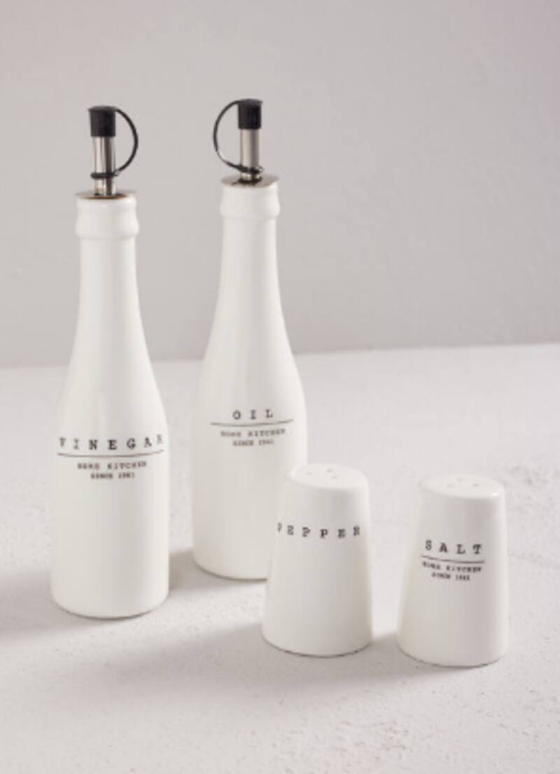El siguiente set de alcuza —que incluye recipientes para servir sal, pimienta, aceite y vinagre— tiene un look moderno y neutro. Incluso la tipografía de cada artículo, como de máquina de escribir, le dan un aire al siglo XX que puede combinar con una decoración sobria y de tonos blancos, negros y grises. Para aliñar con estilo.
