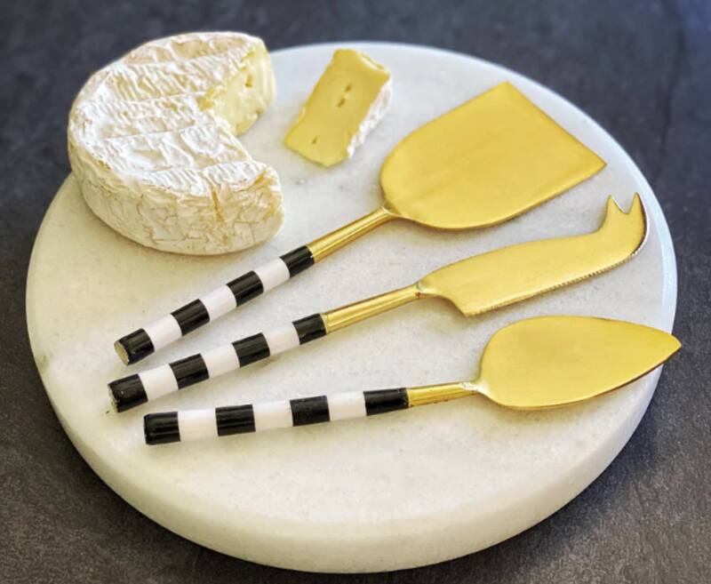 Este pequeño set tiene una gran responsabilidad: ser los facilitadores de una repartición justa de queso. Viene con tres cubiertos —una paleta, un cuchillo y una pequeña espátula— con mangos en blanco y negro y superficie dorada. Un look más llamativo que contrastará muy bien con un delicioso queso. El plato no está incluido.