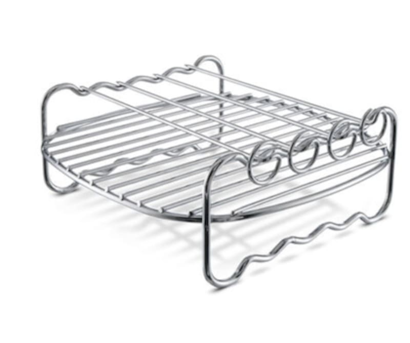Prepara brochetas de pollo o de verduras con este juego de rejillas que contiene cinco brochetas en la parte superior. Las rejillas añaden versatilidad a la freidora de aire, te da opciones de cocinar dos preparaciones a la vez, porque maximizan la superficie de cocción. Estos accesorios son aptos para la lavadora de platos para una fácil limpieza.