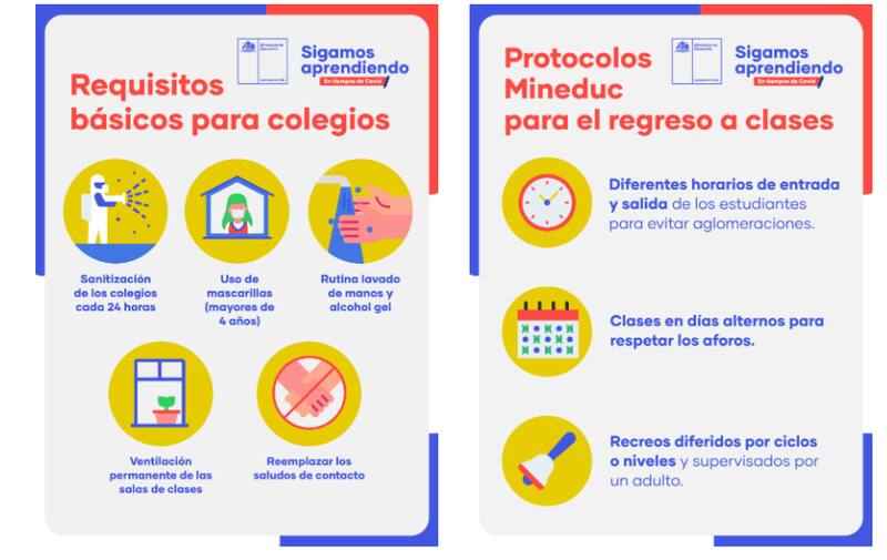 Los horarios diferenciados de entrada y salida, el sistema híbrido de clases y los recreos diferidos por ciclos o niveles son otros de los ejes dentro del protocolo propuesto por Mineduc, el que puedes seguir leyendo en sigamosaprendiendo.mineduc.cl.