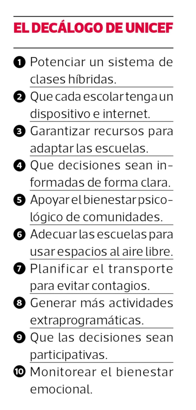 Durante tres meses, Unicef, junto a Educación 2020, América Solidaria y diversas organizaciones, estudiantes y actores de la educación, desarrollaron un decálogo de recomendaciones a las autoridades y sostenedores, que permitirían tener un mejor año escolar. Como padre o madre, es importante que le des un vistazo, sobre todo para que cuadre con la información que están entregando en el colegio de su pupilo.