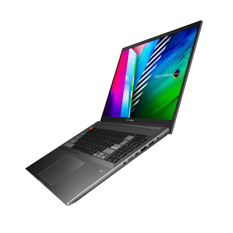 De todos modos, las teclas se sienten firmes, cómodas y suaves al apretarlas, mientras que el trackpad es suficientemente amplio para un trabajo cómodo, además de contar con la funcionalidad de transformarlo en una calculadora u otras herramientas, como un interesante dial virtual. Su sistema de sonido estéreo Harman-Kardon es bastante aceptable y, en cuanto a conectividad, el Vivobook incluye dos puertos USB-C (uno para carga), 2 USB 2.0-A, un puerto HDMI, entrada para auriculares y hasta lector de tarjetas SD. Un bonito detalle es que todas sus pequeñas luces LED indicadoras se ubican al costado del aparato.