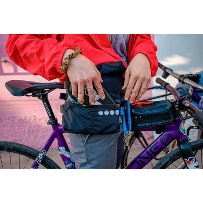 Cata Banfi recomienda dos opciones: un banano WildLama hecho 100% de materiales reciclados y que se puede enganchar en el manubrio de la bici —”siempre me lo elogian”—, y el bolsito de Enhebra Estampa porque “es versátil, cómodo e ideal para llevar herramientas o una botella de agua”.