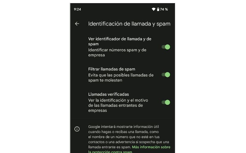 Con la primera sabrás si el número que te llama está categorizado como spam, con la segunda —”Filtrar llamadas de spam”— harás que el teléfono no suene ni vibre cuando estos números te llamen, y con la tercera — “Llamadas verificadas”— podrás conocer si la llamada es de una empresa y cuál es su rubro.
