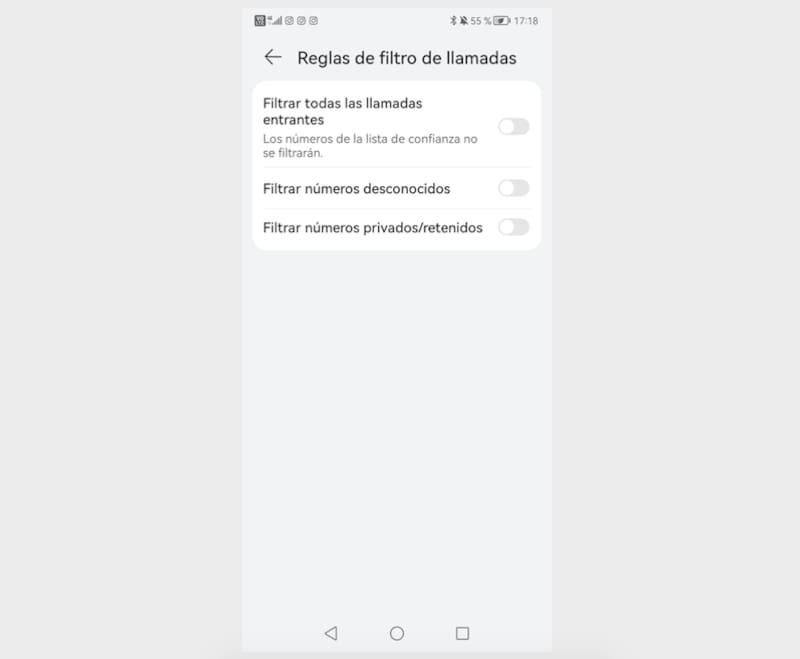 Aquí hay tres opciones: filtrar todas las llamadas —excepto la de los números de confianza—, filtrar números desconocidos —cualquiera que no esté en nuestra lista de contactos— y filtrar números privados/retenidos —aquellos que son anónimos. Para evitar el spam, conviene activar las últimas dos opciones.