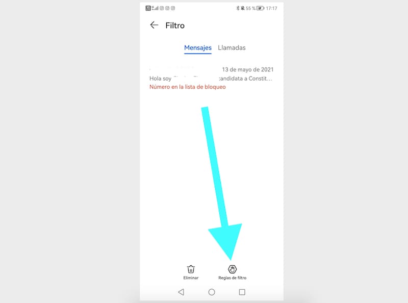 Ahí nos aparecerá el listado de llamadas o mensajes que tenemos bloqueados —si es que alguien ha merecido ese castigo—, pero en la parte inferior de la pantalla hay un botón que dice Reglas de Filtro. Ahí es donde debemos entrar.