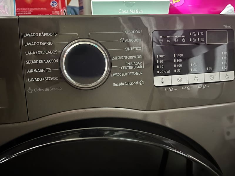 En cuanto a lavar a máquina, sugieren que cada prenda o textil deben estar dentro de una bolsa de lavado, como esas de malla. Luego el ciclo a elegir es delicado o especial para lanas (wool cycle o lana delicados, como puedes ver en la imagen). La idea es que el agua que uses esté fría y el ciclo en el que gire la máquina sea el más bajo y lento. Todas estas precauciones son a favor de cuidar las hebras naturales del tejido, ya que al maltratarse, un tejido puede fácilmente estropearse dentro de una lavadora.
