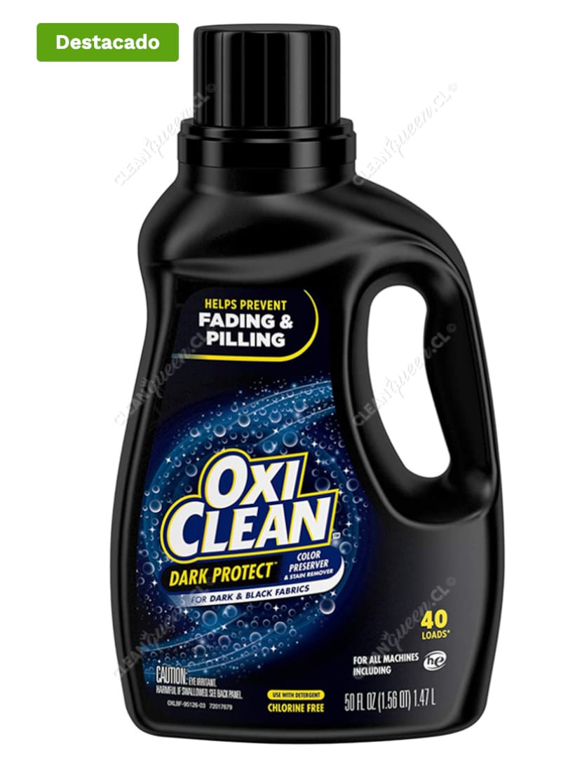 - Cuidado con el quitamanchas: hay varios productos en el mercado que prometen desmanchar, pero cuando los uses debes asegurarte de que sean compatibles con el tipo y color de prenda. Recuerda que el cloro es el enemigo número uno de las prendas oscuras. Un artículo de Discover Magazine menciona en su listado de recomendaciones al Oxiclean Dark Protect como uno de los mejores: no solo limpia de forma eficiente a través de una capa protectora, que mantiene alejada la suciedad, los residuos y los olores, sino que también prolonga la vida útil de la prenda.