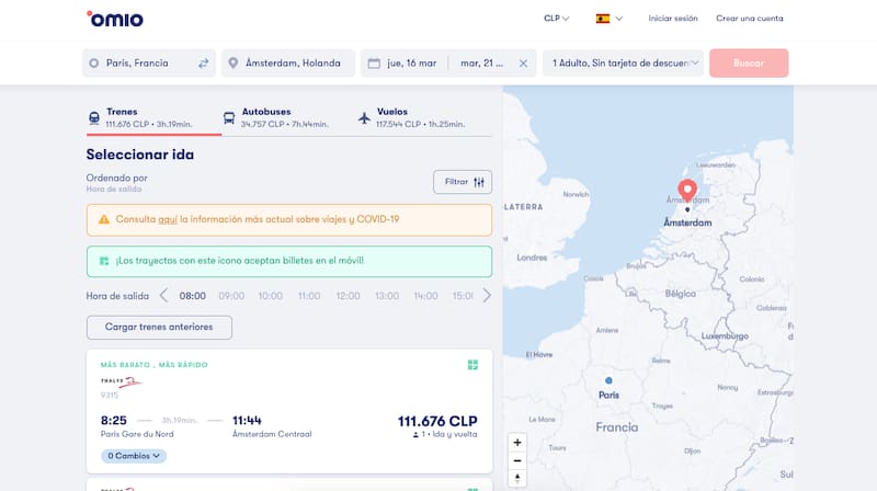 Omio es el buscador que antes se llamaba Go Euro. Como su antiguo nombre lo indica, se especializa en encontrar vuelos, trenes, buses y alojamientos en el Viejo Continente.
