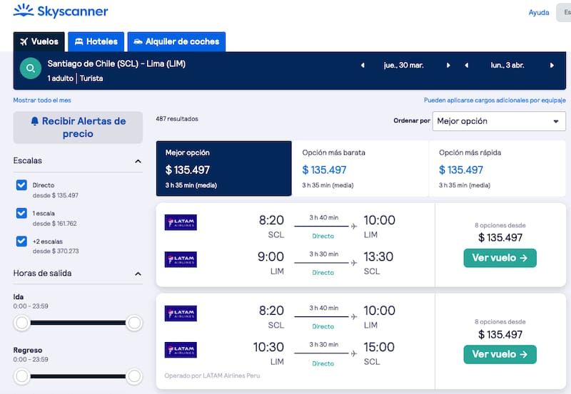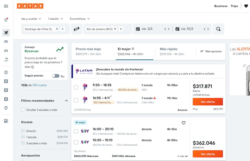 Para Carvacho, por su lado, las mejores son Kayak, Skyscanner y Google Travel. “En general, todas sirven como primer filtro para orientar la búsqueda y saber cómo están los precios”. Su sugerencia es comparar la información que arroja cada plataforma y, una vez que se encuentre una ruta interesante y conveniente, cotizar directamente en la página de la aerolínea.