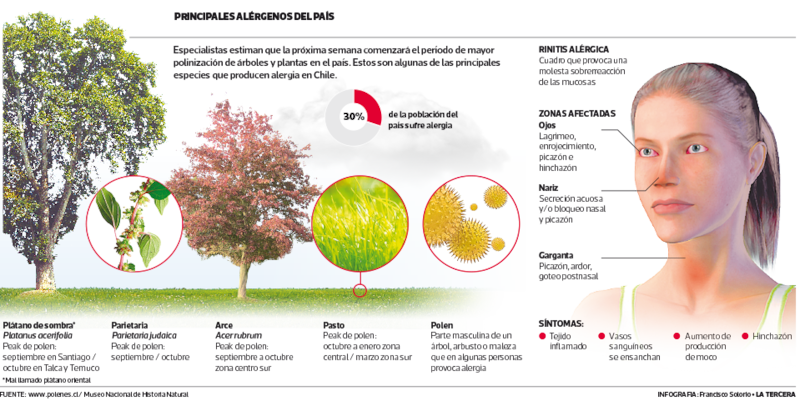 Este invierno, con los inusuales calores y la poca lluvia, la primavera parece haberse adelantado y con ella los problemas para los alérgicos. Bahamondes, al menos, ha recibido más pacientes con estos problemas que en años anteriores, aunque para Pablo Raby, inmunólogo de la Clínica Santa María, esto es relativo. “Hubo un adelanto de la polinización de algunos árboles, pero no es que esto sea muy claro„ porque las fechas de polinización varían entre año y año”.