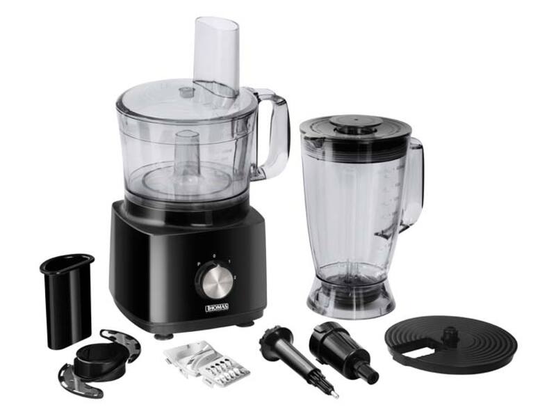Incluye dos vasos y ofrece funciones de picado, rebanado, rallado y licuado. Posee dos velocidades y un pulso.