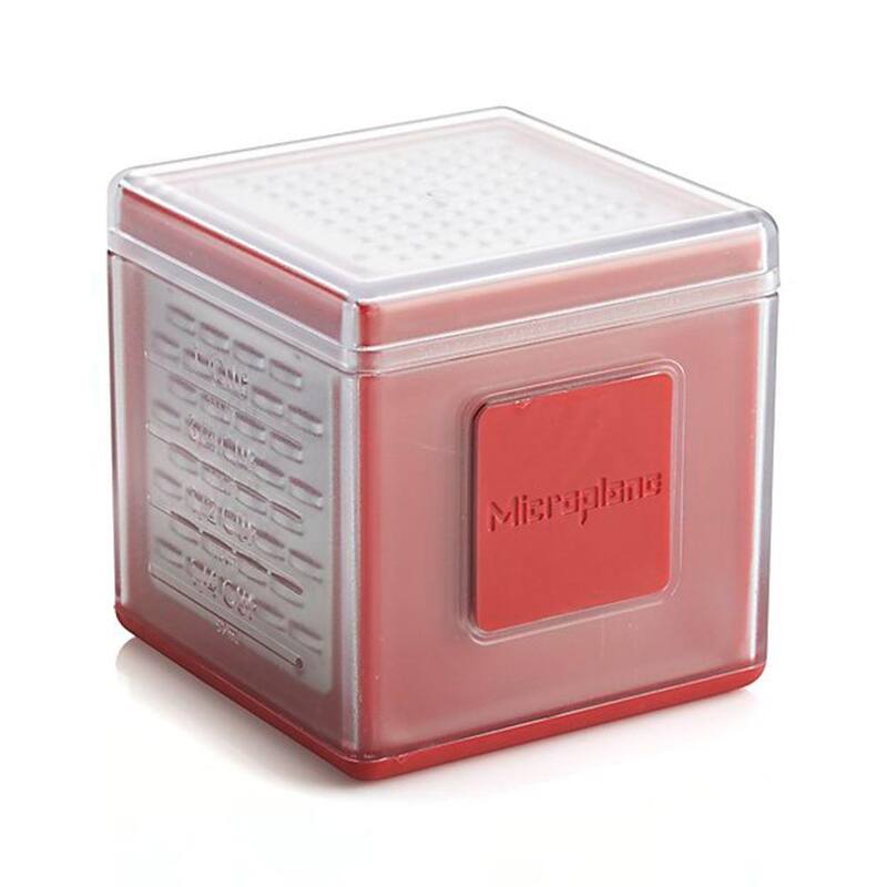 Este rallador en forma de cubo tiene tres estilos de cuchillas, una fina para cítricos y quesos duros, una cinta para chocolate y coco, y una gruesa para queso blandos.