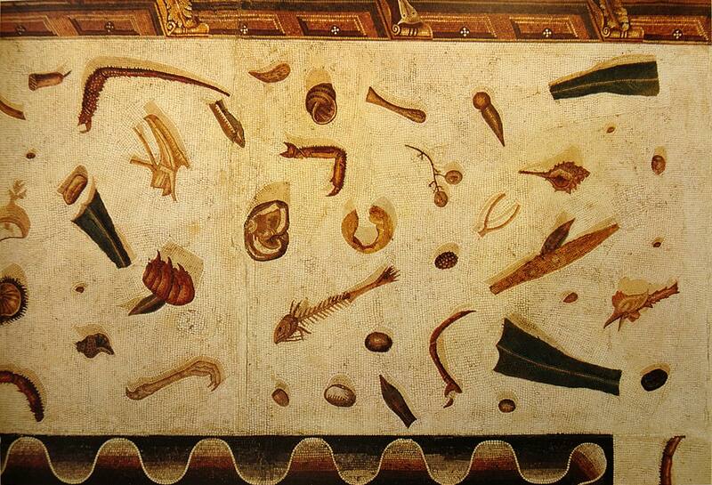 El escritor francés Pascal Quignard cuenta que, en la época helenística del siglo II a.C, el nombre de Soso de Pérgamo se hizo famoso en toda Grecia, debido a los particulares mosaicos decorativos que diseñaba. Fragmentados en teselas para una superficies de un centímetro cuadrado, era común ver representadas cabezas de pescado decapitados, colas de langosta, huesos de pollo, mejillones en estado de descomposición, pieles, uñas, patas, garras, espolones de gallo, entre otros “restos” repartidos en el suelo de un hogar. Naturaleza muerta, calificarían los críticos de arte.