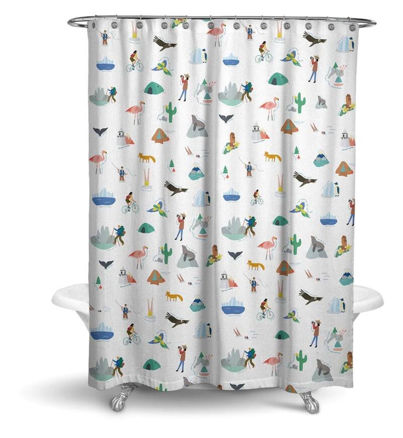 Esta puede ser una buena alternativa para la tina donde se duchen niñas o niños, en especial aquellos que disfrutan de la naturaleza y los paseos al aire libre. En sus ilustraciones hay zorros, cóndores, flamencos y pingüinos, además de personas pescando o andando en bicicleta, cada una con el nombre de un icónico parque nacional chileno. Está confeccionada con tela vinílica impermeable, sin dejar de ser suave y agradable. Sus medidas son de 146 x 180 cm y contiene una bolsa con el mismo diseño.