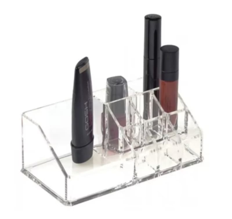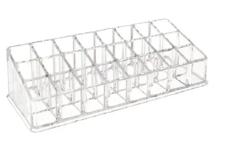 Este pequeño organizador de acrílico transparente tiene compartimentos para clasificar hasta 24 labiales. Si te gusta coleccionar diferentes tipos y colores de lipsticks o bálsamos para los labios, con este artículo tendrás un orden asegurado, además de una vista panorámica de lo que tienes. Sus dimensiones son de 22 cm de altura, por 8 cm de ancho y 5 cm de profundidad.