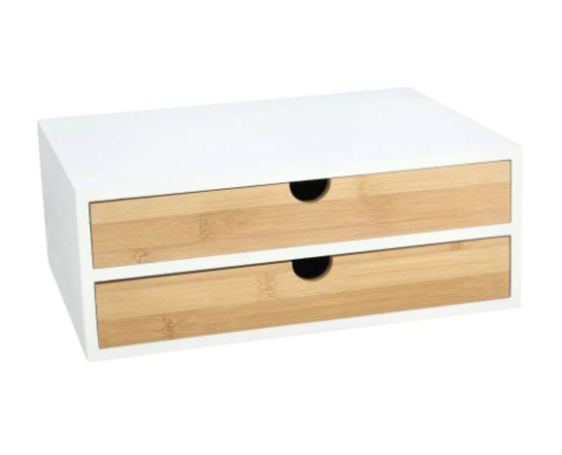 Una mini cajonera de MDF y madera de bambú es una solución elegante para guardar pequeños objetos, como los productos de maquillaje. Por ejemplo, aquí puedes llenar cada cajoncito con una paleta de sombras, delineadores o herramientas como el encrespado de pestañas, pinzas y sacapuntas. Sus dimensiones son de 33 cm de largo por 13,5 cm de alto y 21 cm de profundidad.