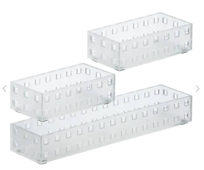 Este set de cajas de poliestireno pueden ser útiles para organizar un cajón de baño o un tocador de maquillaje. Son apilables, deslizables, transparentes y fáciles de combinar. Sus divisores ajustables permiten dividir y ordenar los elementos más pequeños, y sus pies de goma evitan que se rayen las superficies y que se deslice al manipularlo. Las dimensiones de dos cajas son de 14 cm largo, por 7 cm de ancho y 4,3 cm de alto. La tercera, más grande, tiene 28 cm de largo, 7 cm de ancho y 4,3 cm de alto.