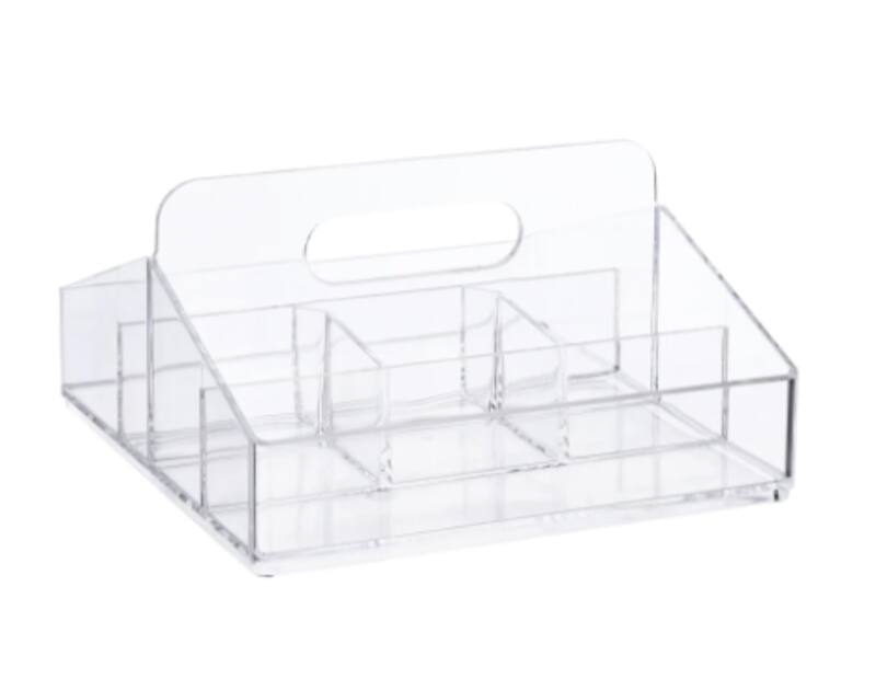 El elemento diferenciador de este organizador de acrílico transparente es que tiene un asa al medio de su estructura, que sirve para transportarlo de una habitación a otra. Muy útil para organizar maquillajes, cremas o también medicamentos, sus dimensiones son de 20,7 cm de ancho, por 20,7 cm de profundidad y 11, 2 cm de alto.