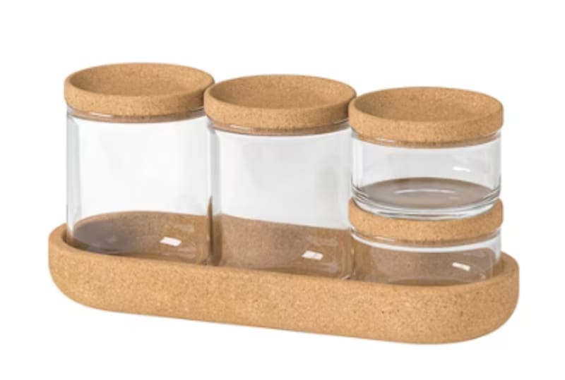 Los siguientes frascos organizadores de vidrio tienen la particularidad de tener tapas de corcho, por lo que tienen un toque más rústico para aportar en el ambiente. Es un set de cinco: dos jarros de 8 cm de diámetro y 5,5 cm de alto; 2 jarros de 8 cm de diámetro y 11 cm de alto; además de una bandeja de 26 cm de largo con 10 cm de alto, por 3 cm de profundidad. En ellos puedes guardar algodones, cotonitos, pads, pinches y otros productos de belleza.