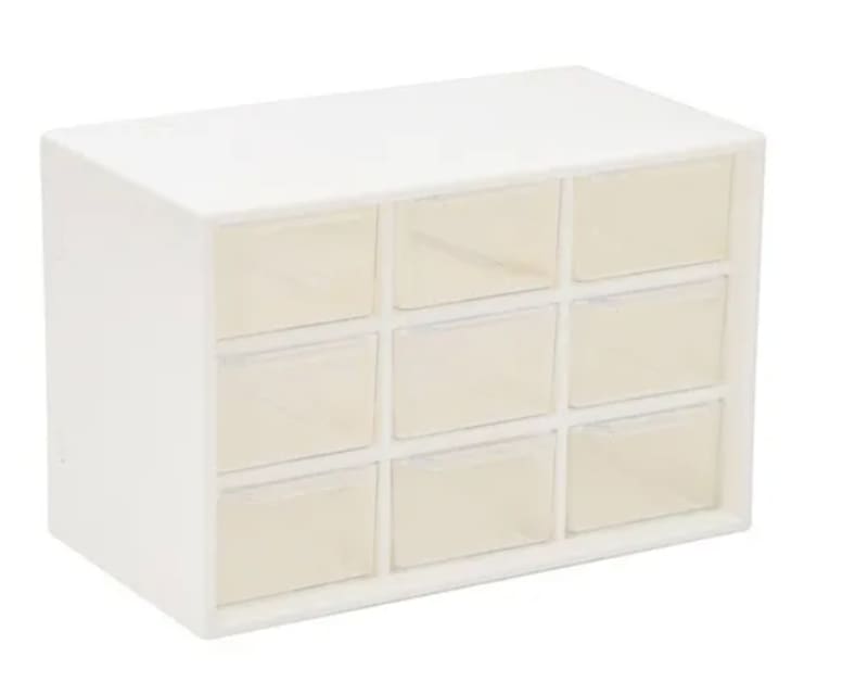 Si tus maquillajes y cosméticos son demasiados, o quieres aprovechar de tener un solo mueble donde guardar además tus productos higiénicos y de salud, esta pequeña cajonera de plástico puede resultar muy útil, tanto para el baño, como para un tocador y hasta una oficina. Tiene nueve pequeños cajones en los que puedes clasificar lo que se te ocurra. Sus medidas son de 11.8 cm de largo, 18 cm de ancho y 9.8 cm de profundidad.