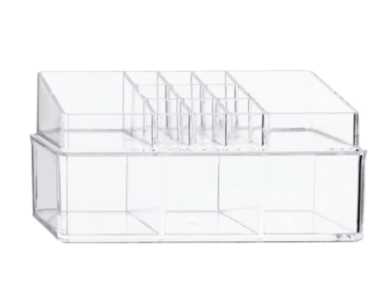 El siguiente organizador de cosméticos acrílico transparente tiene una particularidad: su parte superior es removible, por lo que sirve tanto para organizar maquillajes y cremas como para ser usado de botiquín (y rellenarlo con algodones, gasas y cotonetes). En la parte de arriba, además de dos compartimientos grandes, existen nueve más pequeños que sirven para clasificar bálsamos labiales o mini esmaltes de uñas. La dimensión de este organizador es de 22,8 cm de ancho, por 11,5 cm de alto y 9 cm de profundidad.