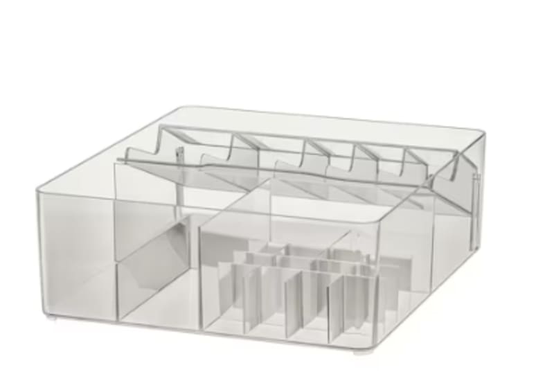Fácil de transportar y de diseño minimalista, este cosmetiquero plástico de Ikea, con espejo y tapa de corcho, puede ser el compañero que buscas si eres una persona en constante movimiento. Esta caja, con dos accesorios y doce compartimentos pequeños, es ideal para guardar pinzas, limas, tijeras, lentes de contacto y maquillajes. Sus dimensiones son de 24 cm de largo por 17 cm de alto. Para limpiarlo, basta con pasarle un paño humedecido con detergente suave y luego secar con un paño limpio.