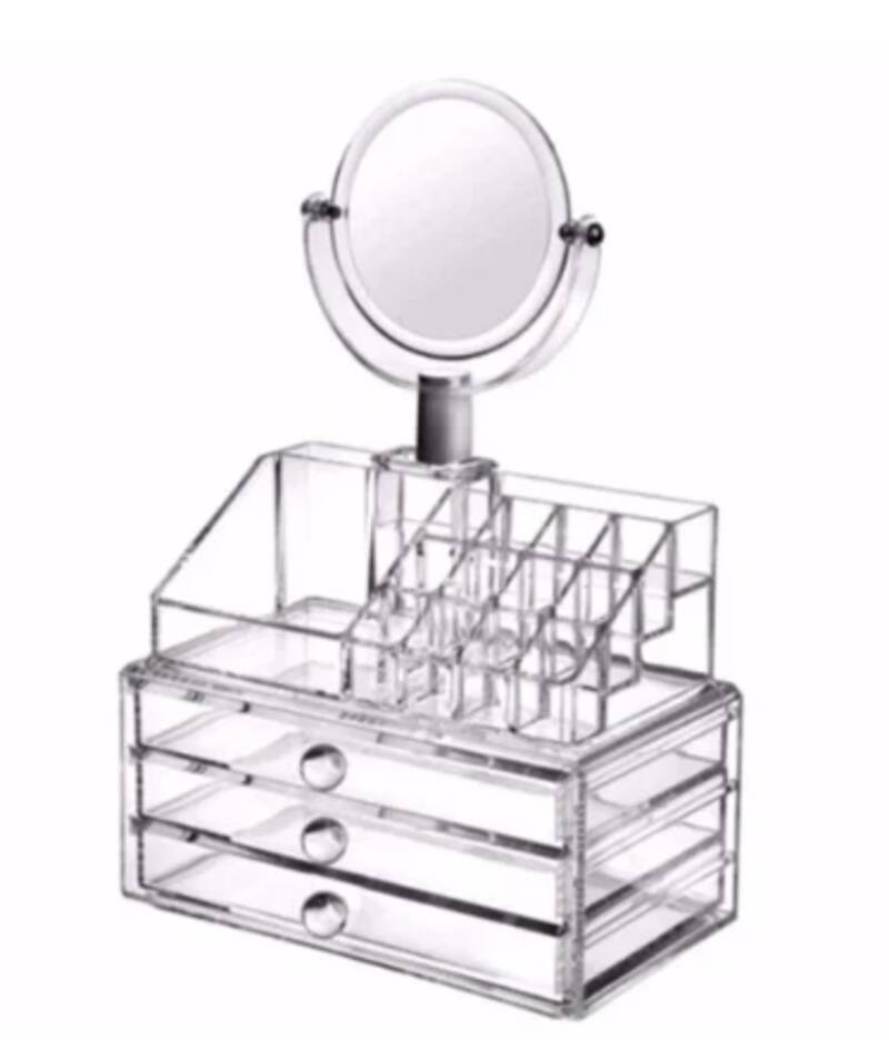 Este cosmetiquero de acrílico incluye un espejo de dos caras. Contiene tres cajoneras en su parte inferior y separadores en su parte superior, que puedes usar para clasificar productos como labiales, esmaltes de uñas y otros artículos de belleza de menor volumen. Sus dimensiones son de 24 x 14 x 18 centímetros, un tamaño compatible para un tocador, una cómoda o un mueble de baño.
