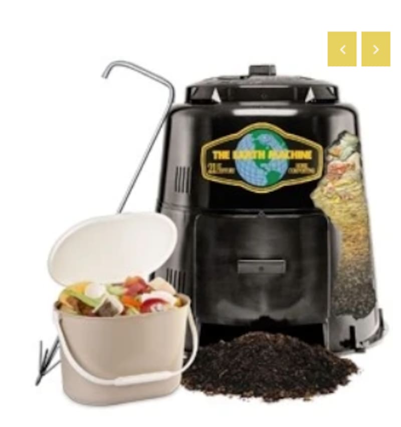 Es un modelo canadiense, especial para el aire libre. Tiene una capacidad de 300 litros, es resistente a los rayos UV y cuenta con 10 años de garantía. El kit incluye un bastón aireador y un contenedor para residuos compostables de cocina, con capacidad 8 litros y de color beige. Medidas: 90 cm de diámetro en la base y 75 cm de altura.