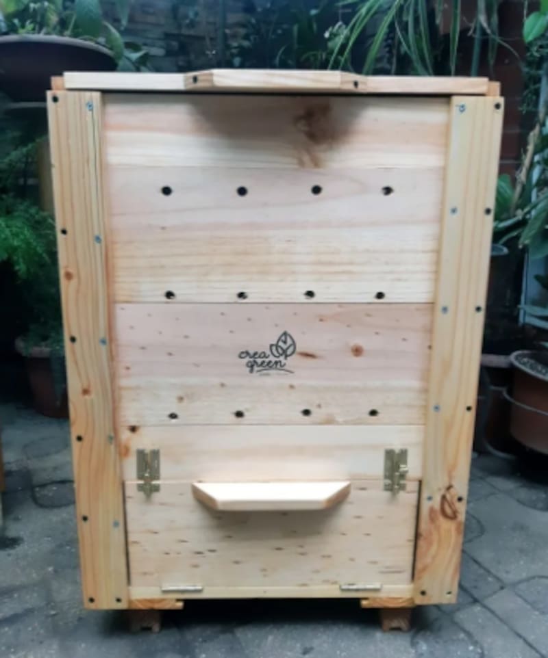 Se trata de una compostera fabricada con madera, que permite reciclar y transformar tu basura orgánica. Esta madera fue tratada con aceite de linaza para que su vida útil sea más prolongada y tiene una capacidad de 175 Litros. Sus medidas son: 58 cm de largo, 58 cm de ancho y 88 cm de alto.