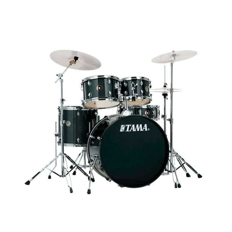 Esta batería básica de Tama incluye bombo (con pedal HP10), 2 toms (uno de 10“ x 7″ y otro de 16“ x 15″), un tom de piso (de 30 x 20cm) y una caja, además de sus respectivos soportes y uno para hi-hat y otro para platillo recto.