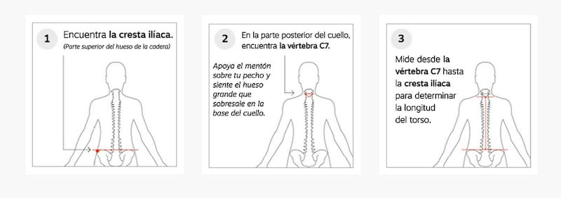 Cada marca tiene su tabla de tallas —casi siempre dividida en S, M, L o XL—, pero para conocer con certeza cuál es la de uno, hay que hacer una medición de la longitud del torso. Esto se hace por la espalda y consiste en ubicar la vértebra C7 —el hueso que sobresale en el cuello al mirar hacia abajo— y la cresta ilíaca —la parte superior del hueso de la cadera. Con la ayuda de otra persona y una huincha, se mide la distancia entre un punto y otro, y esa cifra servirá para saber la talla.