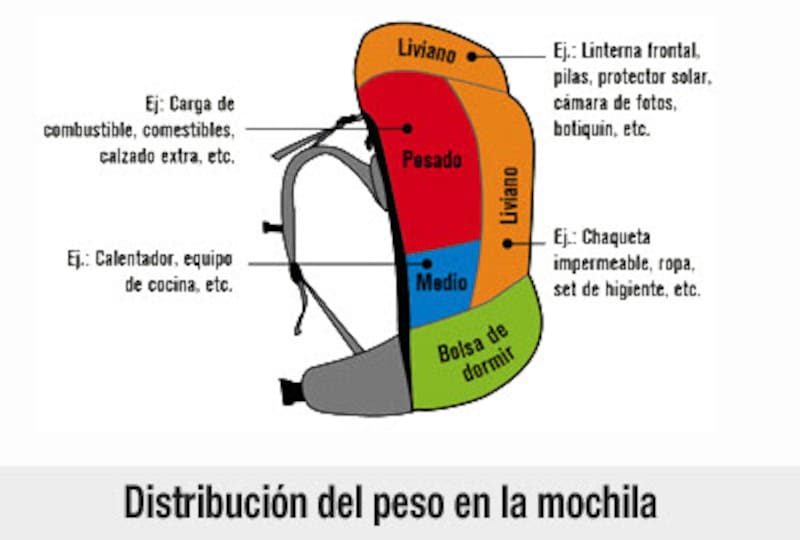 “Vas a caminar todo el día y llegarás recién de noche a montar el campamento: no vas a necesitar las cosas para dormir”, explica Vergara. “Por eso, el saco es lo primero que hay que echar en la mochila, ya que además le dará estructura, la dejará de pie”. Luego, hacia la espalda, deben ir las cosas pesadas que no ocuparás de inmediato, como la carpa, el agua, la comida y los utensilios de cocina, cerca del centro de gravedad.