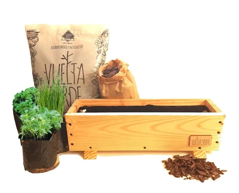 Una buena alternativa es hacerse de las huertas que vienen listas para instalarse. Como esta de Vuelta Verde, que además del cantero de madera impermeabilizada, incluye 10 litros de sustrato (45% de tierra de hoja, 45% de compost y 10% de perlita), 2 litros de mulch (para cubrir y proteger la tierra) y tres almácigos de temporada.