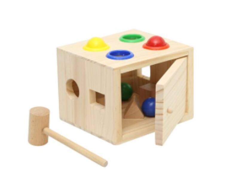 Esta caja incluye figuras geométricas para encajar y un martillo. Se trata de una alternativa del tipo encaje didáctico, que ayuda a estimular la capacidad motriz, visual y auditiva.