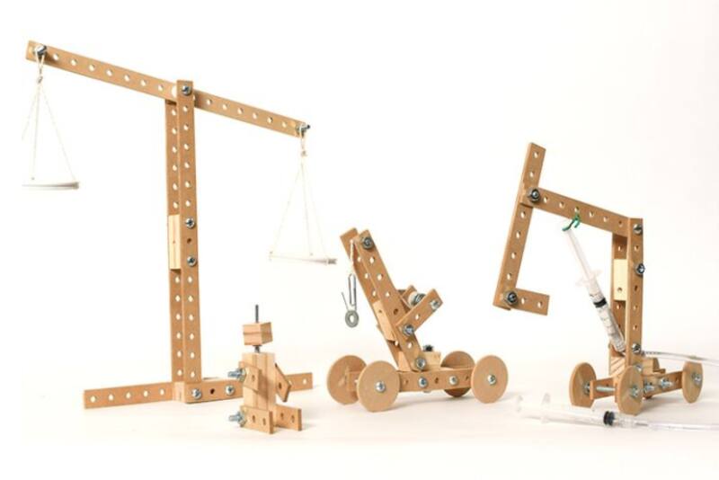 Son más de 100 piezas —entre madera y tornillos— con las cuales se pueden construir diferentes modelos para armar y experimentar. Con ellas, los niños pueden desarrollar proyectos propios y únicos. Se pueden construir una grúa mecánica, un auto con accesorios, un triciclo o un molino, solo por nombrar algunas opciones, las que vienen con todas las indicaciones necesarias para montarlas. Además, se le pueden incluir artículos que estén en la casa, como cuerdas o telas.