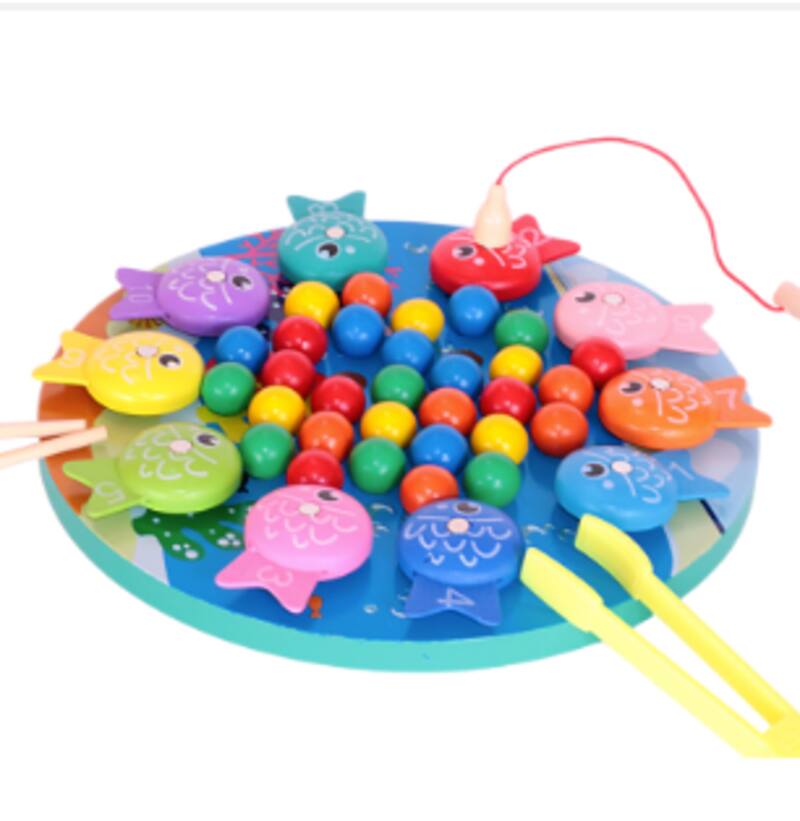 Un juego clásico, que probablemente jugaste al igual que tus papás y tus abuelos. Además de la pesca milagrosa, este set incluye pinzas y pelotas para hacer patrones y así potenciar la motricidad fina.