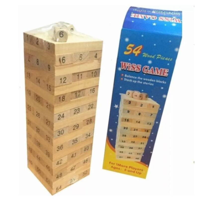 Un juego transversal y atemporal. A grandes rasgos, el objetivo es retirar bloques de una torre por turnos y colocarlos en su parte superior, hasta que ésta se caiga. Las piezas están numeradas y contiene dados, de manera que se puede jugar con múltiplos y sumatorias, según lo que tú o el niño estimen. En total son 54 piezas de madera.
