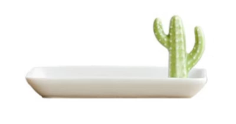 Las plantas pueden estar en todos los rincones. Si no es con una especie viva, puede ser con una réplica o decoración. Como este joyero, que es una ternura de cerámica. De base rectangular, tiene un lindo cactus para dejar los anillos o aros con más volumen. Otro uso es como posa tijeras de jardín, de manera de siempre tener a la mano aquellas que se usen más en el día a día.